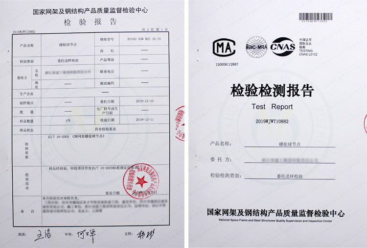 所用螺栓球節(jié)點(diǎn)均通過國家產(chǎn)品質(zhì)量檢驗(yàn)